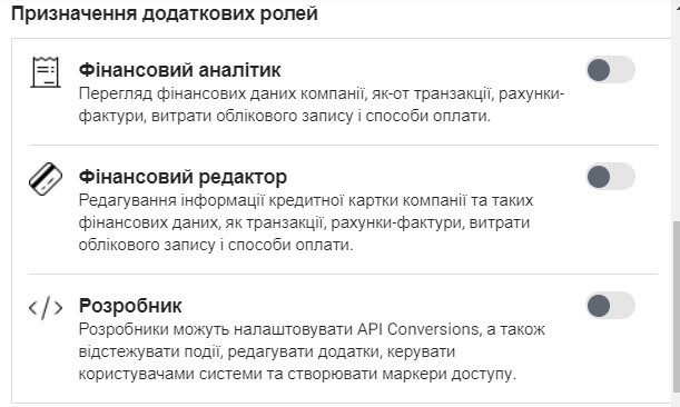 Виберіть роль відповідно до того, що потрібно робити новому користувачу у рекламному кабінеті Facebook. Якщо ви хочете, щоб користувач міг створювати та керувати рекламними кампаніями, краще призначити йому роль редактора або адміністратора.