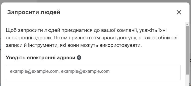 Введіть email користувача, якому ви хочете надати доступ до рекламного кабінету Facebook. Зверніть увагу, що для додавання нового користувача необхідно, щоб він уже мав обліковий запис на Facebook. Якщо користувач ще не зареєстрований на Facebook, то потрібно спочатку створити обліковий запис.