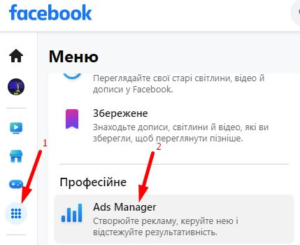 Першим кроком необхідно відкрити рекламний кабінет Facebook, де ви хочете дати доступ. Для цього зайдіть у свій обліковий запис Facebook, натисніть на 9 точок з лівого боку екрану та знайдіть розділ "Професійне". Знайдіть та натисніть на "Ads Manager".