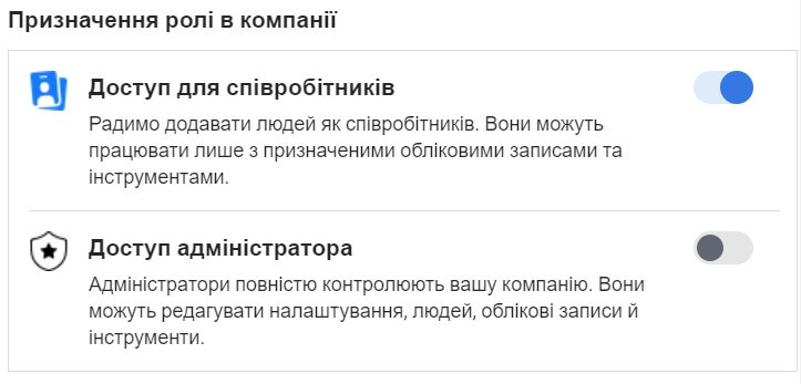 - Адміністратор : має повний доступ до всього в рекламному кабінеті Facebook і може призначати інших адміністраторів.